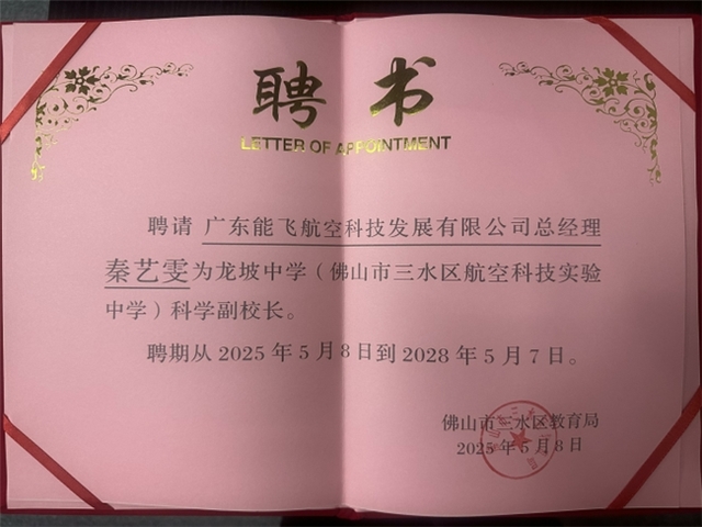 佛山市三水区航空科技实验中学科学副校长秦艺雯聘任证书