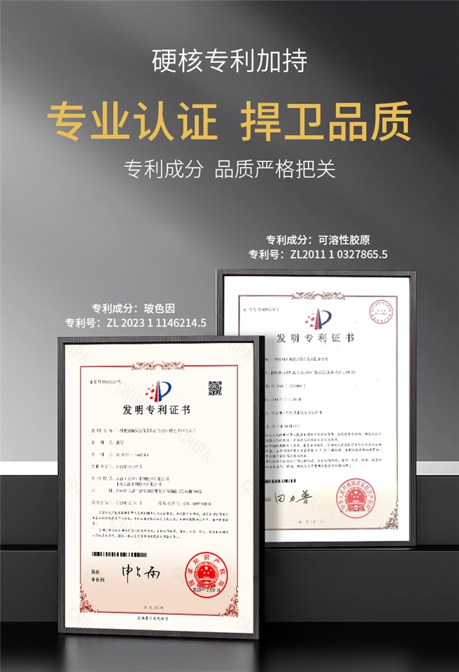 它蕴含了中国发明专利加持的双重核心:专利成分玻色因(羟丙基四氢吡喃三醇)专利号:ZL 202311146214.5 与 专利成分:可溶性胶原专利号:ZL 201110327865.5。这两个专利号的背后,是抗老界最稳妥的“温和抗老”组合拳。前者负责撑起肌肤支架,后者负责填充胶原空洞。